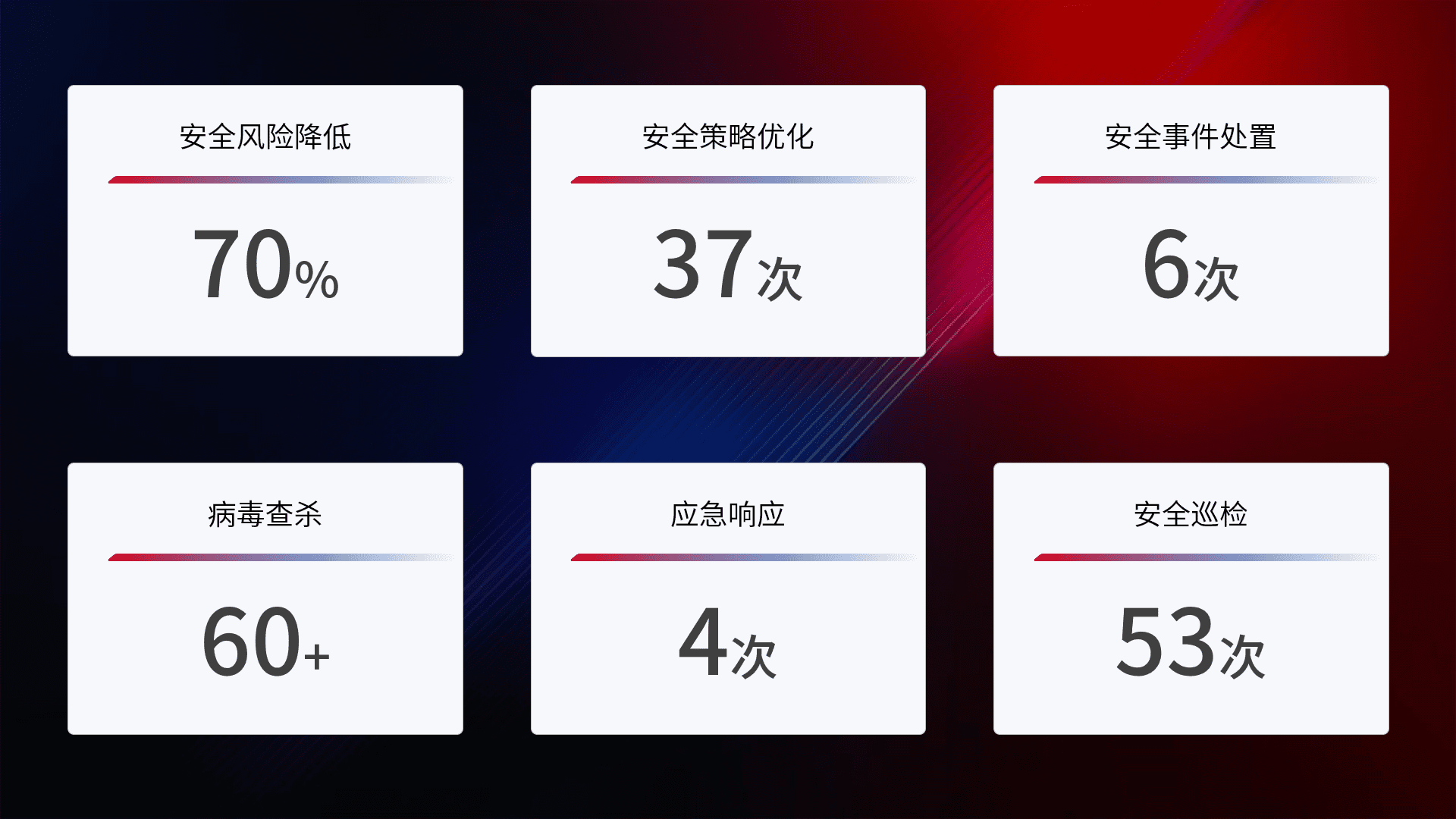 提供全面的安全事件报告体系,,,包括处置报告、、周报、、季度和年度总结,,,,结合持续监控,,,,帮助客户深入了解网络安全状况。。