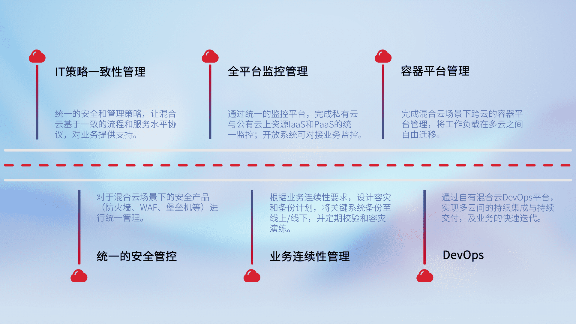 通过多云纳管,,,以统一的资源数据模型把客户的云资源进行抽象和封装,,进而实现对多云资源的统一操作,,保障云资源管理的可靠性、、稳定性与可用性。。。。量身定制化运维内容,,配置、、、、开发运维、、、、补丁管理、、、、备份、、、监控、、、、认证和访问管理、、、、审计和日常巡检等,,保障在用云过程中的可靠度,,,稳定度以及高可用率。。。。